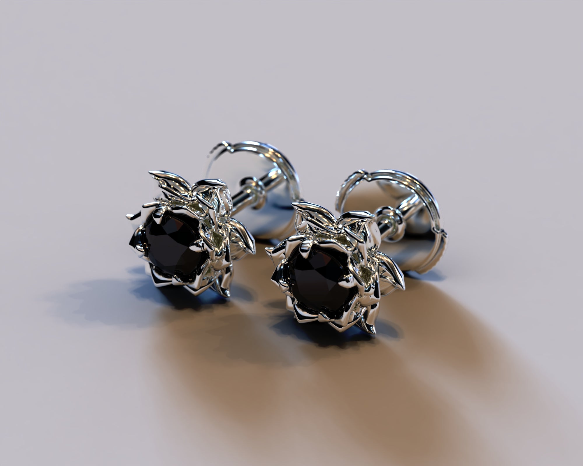 Black Diamond earrings, inspired by the Art Nouveau style, are set in a lotus shape and crafted in 14k white gold, offering an edgy and elegant look. This pair serves as a perfect gift for special occasions and beautifully complements our collection of engagement rings.