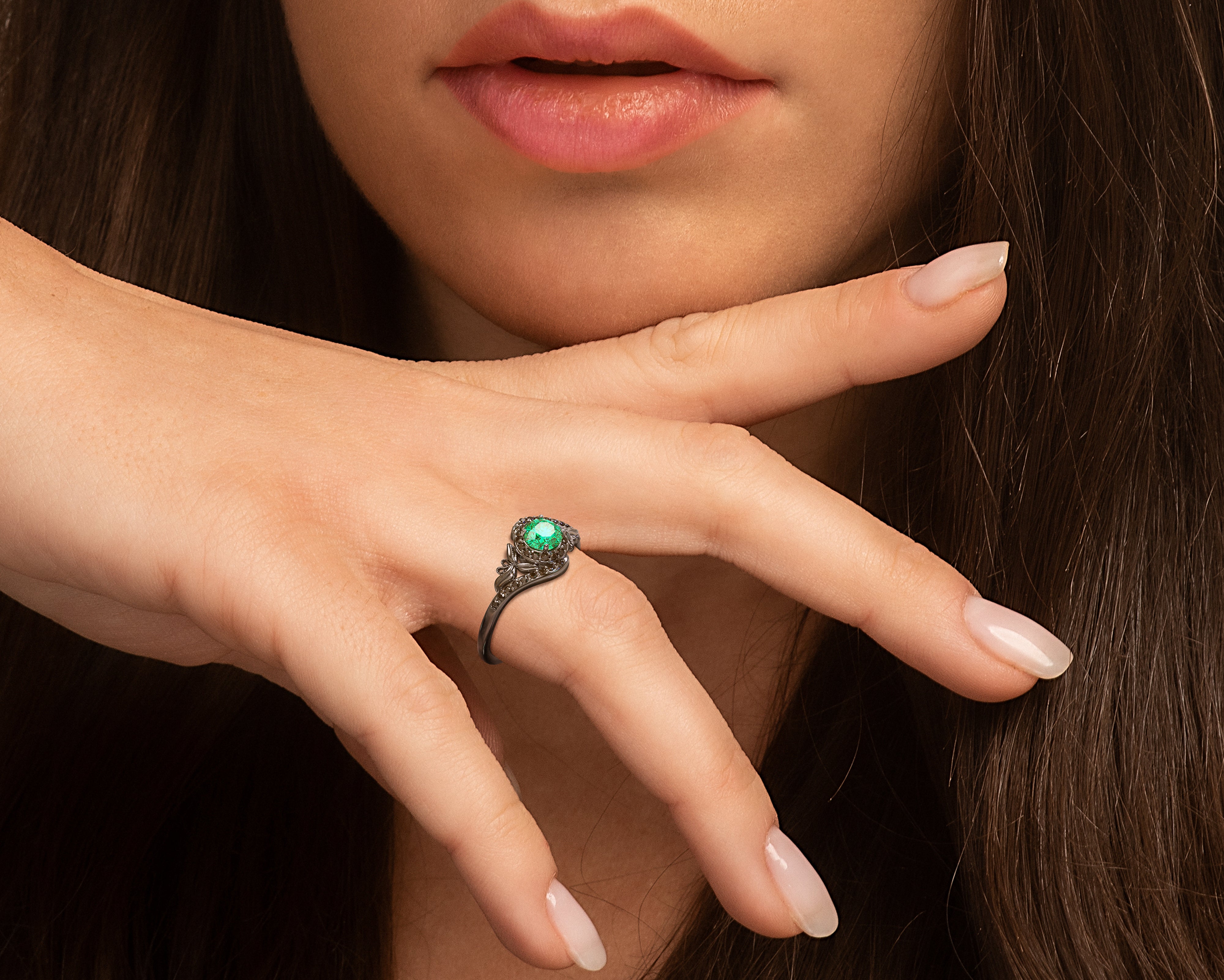 | As a man, there's no better way to showcase your love for her than by presenting a stunning ring. The Floral Black Gold Emerald Engagement Ring is an ideal option to express the depth of your affection in a charming and elegant manner. Gothic Edition. Vidar Boutique. |